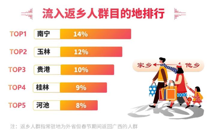 春節(jié)期間,廣西迎來(lái)客流高峰。據(jù)統(tǒng)計(jì),廣西流入客流同比增長(zhǎng)7%,流出客流同比增長(zhǎng)18%,凈增客流超過1000萬(wàn)人。其中,返桂人潮占比25%,男性成為返鄉(xiāng)主力,占比58%?!?0后”和“90后”人群成為返鄉(xiāng)主流,占比超過50%。交通出行方面,短途游備受青睞,200-500公里出行占比達(dá)到48%,汽車成為首選出行方式。