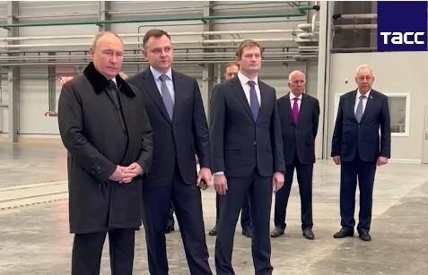 當?shù)貢r間2月21日,俄總統(tǒng)普京視察喀山飛機制造廠。圖片來源:塔斯社視頻截圖
