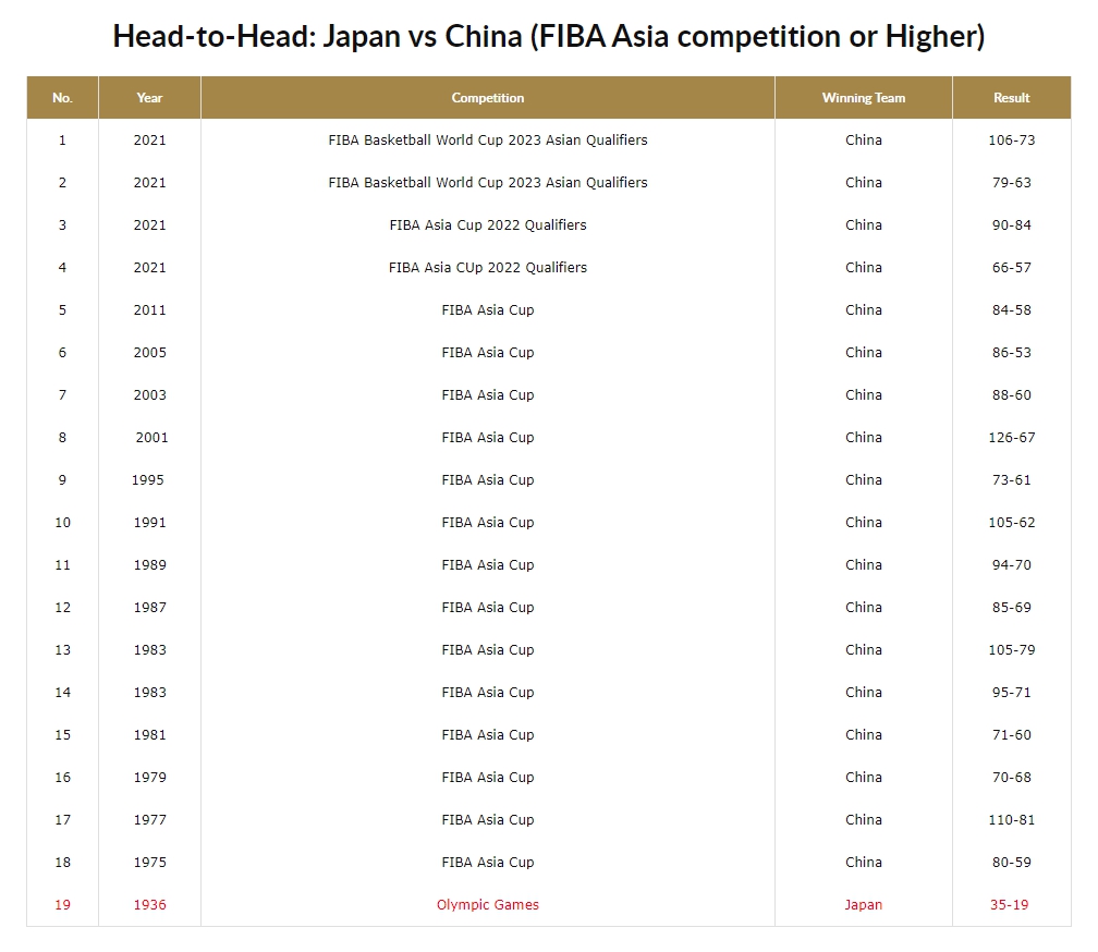 據(jù)國(guó)際籃聯(lián)統(tǒng)計(jì),自1936年奧運(yùn)會(huì)以來(lái),中國(guó)男籃從未在FIBA國(guó)際籃聯(lián)舉辦的亞洲杯及更高級(jí)別比賽中負(fù)于日本男籃。