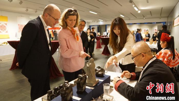 來(lái)賓欣賞石雕非遺手工藝。柏林中國(guó)文化中心供圖