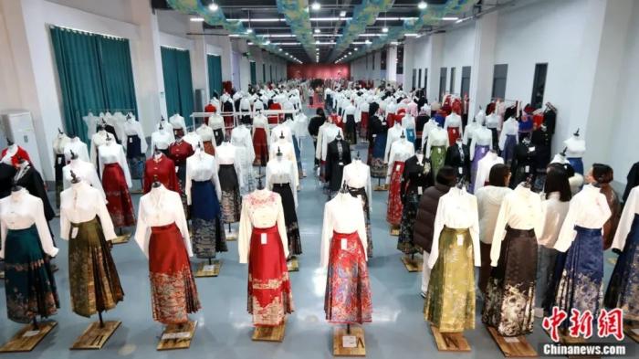 曹縣辰霏服飾有限公司作為線上和線下銷售為一體的漢服企業(yè),在節(jié)前就大約售出了1.6萬件馬面裙,這一數(shù)字是去年的3到4倍。據(jù)該公司總經(jīng)理孟曉霞介紹,春節(jié)期間,基本每天都有客戶選購龍年拜年服,每天大約200人次至300人次的客流量,“印有龍鳳等圖案的原創(chuàng)紅色系馬面裙尤為受歡迎。”