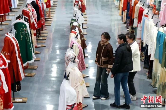 曹縣漢服協(xié)會會長胡春青介紹說,目前,曹縣生產(chǎn)漢服的企業(yè)有2282家,預(yù)計整個春節(jié)期間曹縣拜年服銷售額將超過4億元。