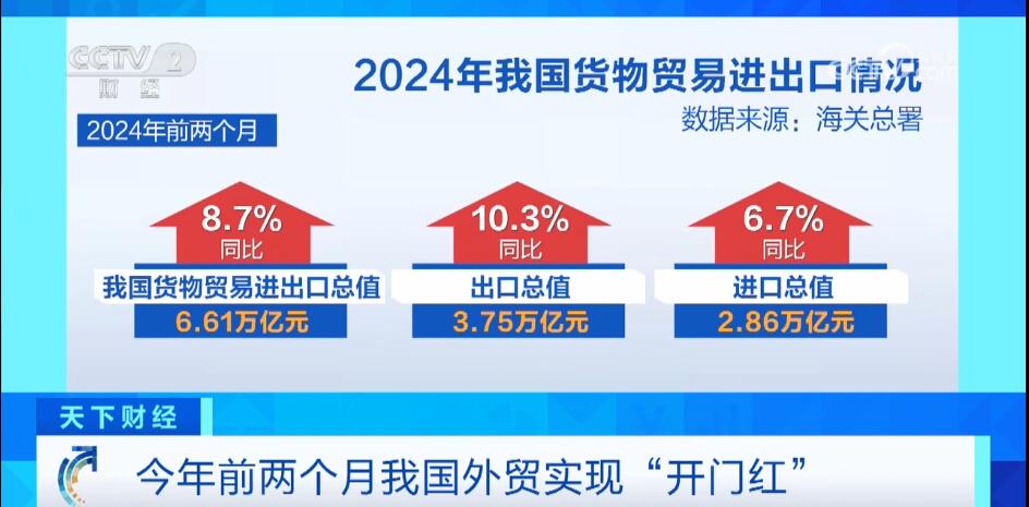 今年前2個(gè)月,我國(guó)貨物貿(mào)易進(jìn)出口總值6.61萬(wàn)億元,同比增長(zhǎng)8.7%。其中,出口3.75萬(wàn)億元,同比增長(zhǎng)10.3%;進(jìn)口2.86萬(wàn)億元,同比增長(zhǎng)6.7%。