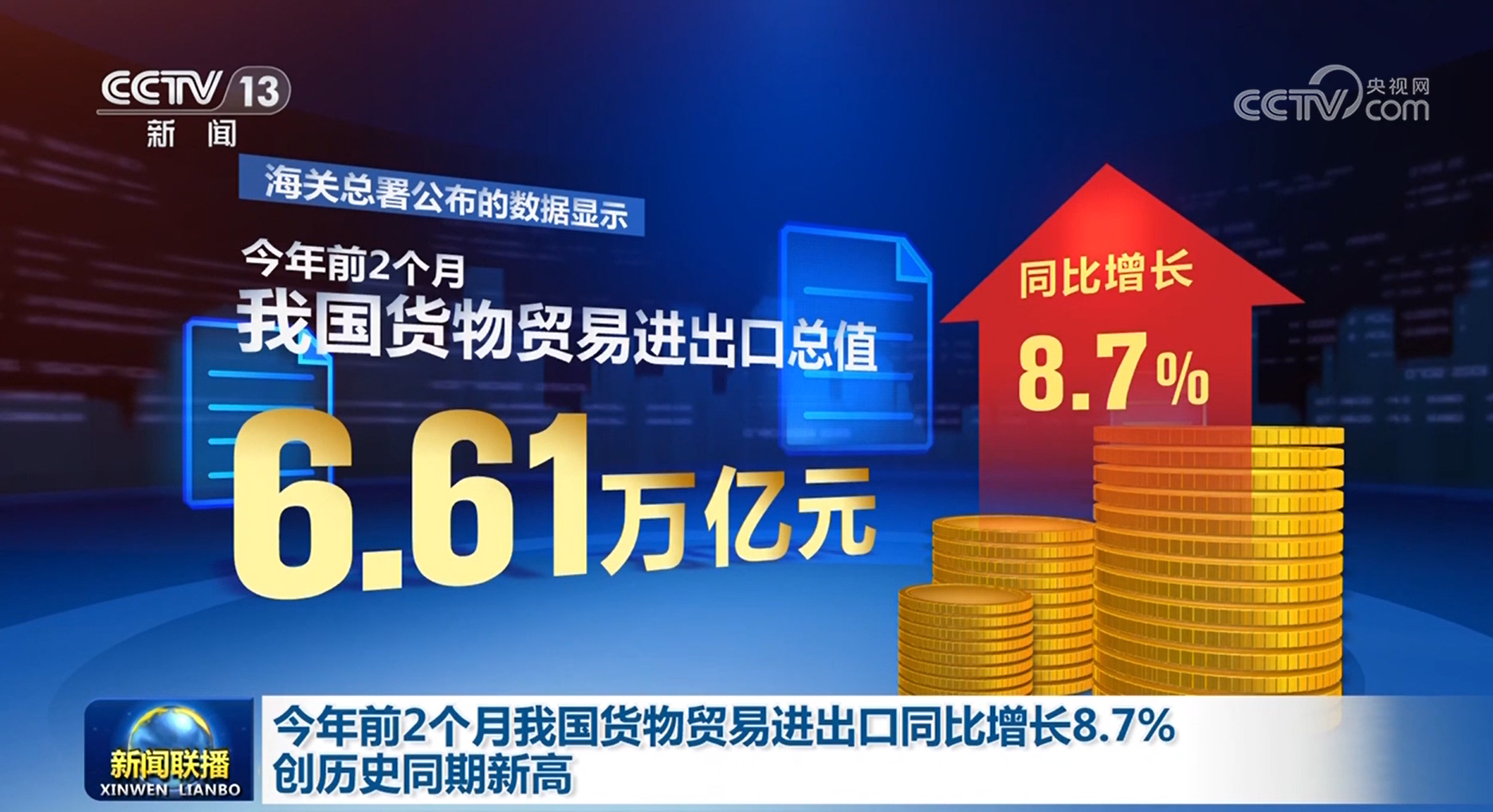 央視網(wǎng)消息(新聞聯(lián)播):記者今天(3月7日)從海關(guān)總署獲悉,今年前2個(gè)月,我國(guó)貨物貿(mào)易進(jìn)出口規(guī)模創(chuàng)歷史同期新高,外貿(mào)實(shí)現(xiàn)良好開(kāi)局。