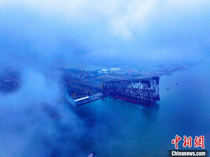 3月12日,亞洲第一深水導管架“海基二號”在廣東珠海建造完工。這是“海基二號”導管架裝船后全景。(中國海油供圖)