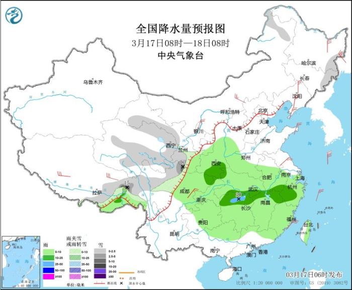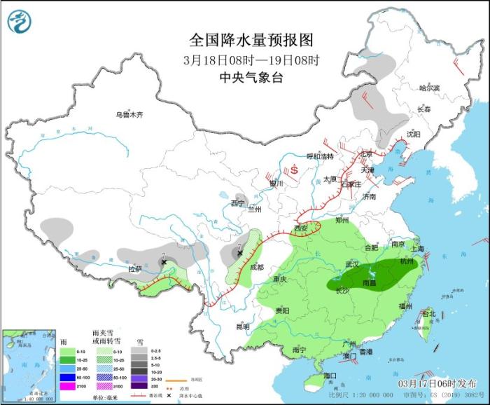 3月17日08時至18日08時,西藏東部、青海東北部和南部、甘肅南部、川西高原北部、內(nèi)蒙古東北部、黑龍江東部、吉林東部等地部分地區(qū)有小到中雪或雨夾雪,其中,西藏東部、川西高原北部等地局部地區(qū)有大到暴雪(10~15毫米)。西藏東南部、西北地區(qū)東部、西南地區(qū)東部、黃淮西部、江淮中西部、江漢、江南、華南北部等地部分地區(qū)有小到中雨,其中,湖南北部等地部分地區(qū)有大雨(25~30毫米)。內(nèi)蒙古中西部、黑龍江東部、遼寧中北部、遼東半島、山東半島、江蘇中部、四川盆地中部等地部分地區(qū)有4~6級風。