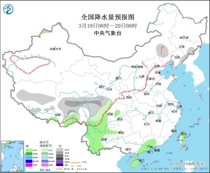 3月19日08時至20日08時,內(nèi)蒙古東南部、吉林東部、西藏北部、青海南部、西南地區(qū)北部等地部分地區(qū)有小雪或雨夾雪,其中,西藏東部和北部、青海南部、川西高原北部等地部分地區(qū)有中雪。西藏東南部、四川盆地西南部、四川南部、云南大部、廣東西南部和中部、海南島、臺灣島大部等地部分地區(qū)有小雨。內(nèi)蒙古東南部和中部、遼寧南部和西部、山東半島等地部分地區(qū)有4~5級風。