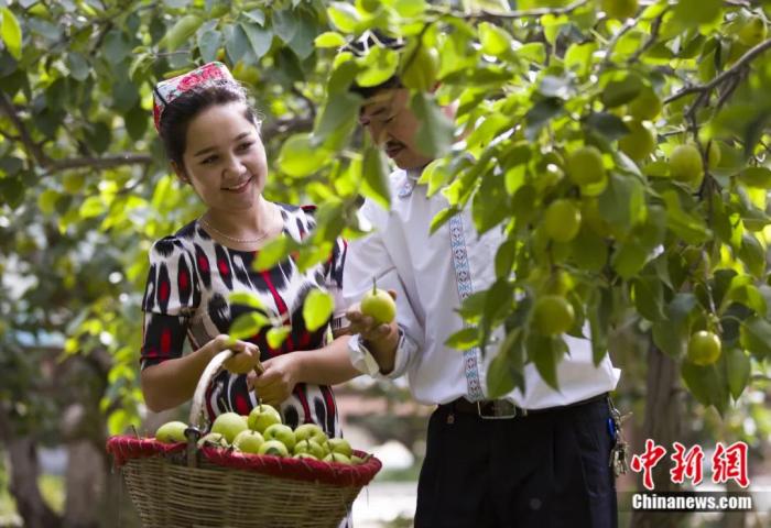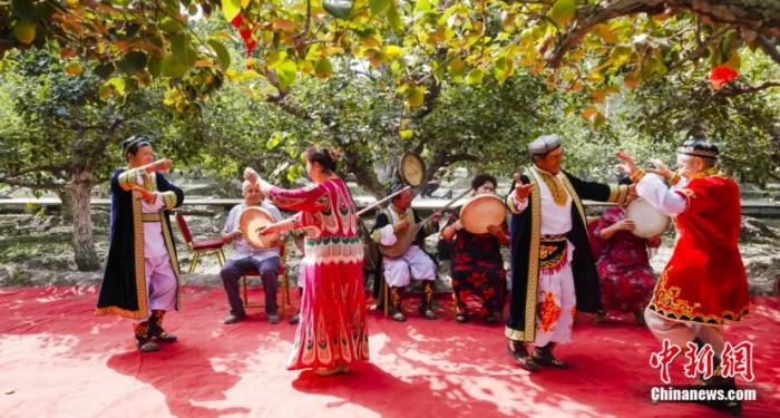 香梨成熟的季節(jié),當?shù)卮迕裣灿憷娉墒?,歡快起舞。姚謙 攝