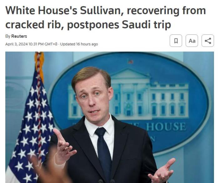 中新網(wǎng)4月4日電 據(jù)路透社報(bào)道,白宮當(dāng)?shù)貢r(shí)間3日表示,美國(guó)總統(tǒng)國(guó)家安全事務(wù)助理沙利文肋骨骨折,目前正在康復(fù),其原定本周前往沙特阿拉伯的計(jì)劃因此被推遲。