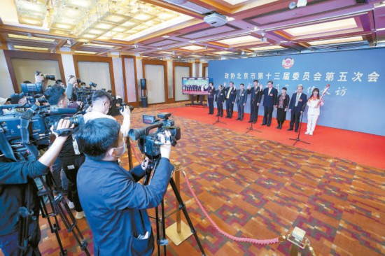 昨天,市政協(xié)十三屆五次會議舉辦“我是委員”集體采訪。8名委員在現(xiàn)場,1名委員通過視頻圍繞“冬奧有我”“科創(chuàng)中心建設(shè)”“履職為民”三個主題回答記者提問。 本報記者 方非攝