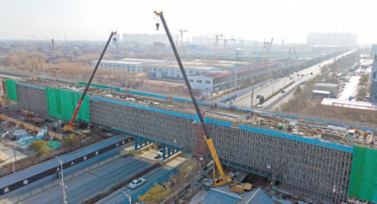 京唐城際鐵路燕郊段跨思菩蘭路連續(xù)梁建設(shè)現(xiàn)場。 河北日?qǐng)?bào)記者 趙永輝攝