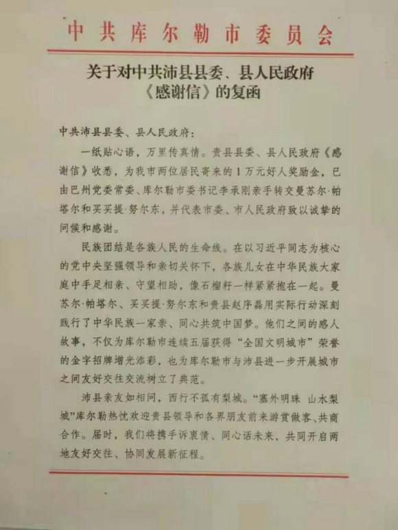 沛縣縣委、縣政府獲悉此事后十分重視,1月2日,以沛縣縣委、縣政府的名義,給新疆維吾爾自治區(qū)庫(kù)爾勒市委、市政府發(fā)去了一封感謝信,并從沛縣“好人基金”中拿出1萬(wàn)元獎(jiǎng)金,請(qǐng)庫(kù)爾勒市委、市政府轉(zhuǎn)交給曼蘇爾·帕塔爾和買買提·努爾東兩人,以獎(jiǎng)勵(lì)二人的善行之舉,這才有了本文開頭庫(kù)爾勒市給沛縣回應(yīng)“感謝信”復(fù)函那一幕。