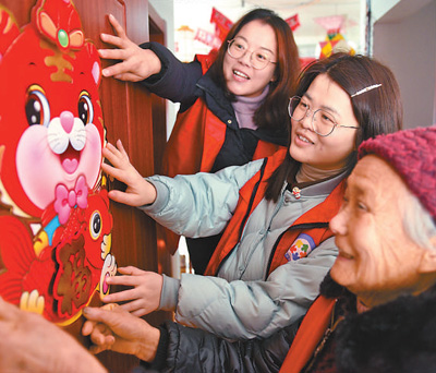 近日,安徽省當涂縣五彩社會工作服務(wù)中心的志愿者與空巢老人一起貼年畫,為老人家增添節(jié)日喜慶氣氛。