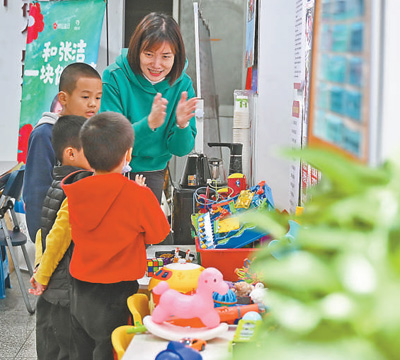 在福建省福州市晉安區(qū)鼓山鎮(zhèn)“村童媽媽聚樂部”志愿服務(wù)站,志愿者張潔在教小朋友唱歌。