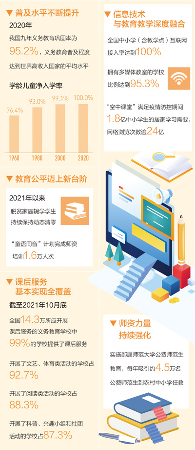 黨的十八大以來,在以習近平同志為核心的黨中央堅強領導下,我國義務教育取得了舉世矚目的成就:2020年,我國九年義務教育鞏固率為95.2%,義務教育普及程度達到世界高收入國家的平均水平;實施義務教育薄弱環(huán)節(jié)改善和能力提升項目,發(fā)展“互聯(lián)網(wǎng)+”教育助力城鄉(xiāng)教育均衡,全國義務教育基本均衡已經(jīng)全面實現(xiàn)……讓適齡兒童少年有學上、上好學,讓每個孩子都能享有公平而有質(zhì)量的教育,正在成為現(xiàn)實。