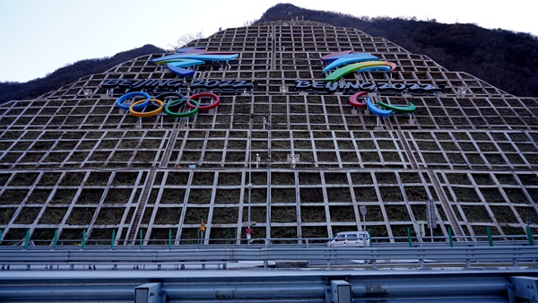 京禮高速沿線護坡布置冬奧會、冬殘奧會會徽標志景觀。