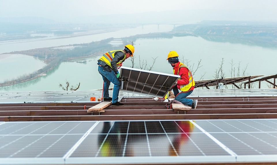 1月7日,施工人員在高空中安裝光伏板。芮城縣莊上村在“2MW光儲直柔直流微網(wǎng)”項目建設(shè)中,嚴(yán)格按照安全施工要求,對高空作業(yè)人員使用的安全帶、頭盔、手套等設(shè)備,作業(yè)之前逐個檢查,并對高空作業(yè)人員進(jìn)行安全常識教育,做到安全生產(chǎn)萬無一失。(薛俊攝)