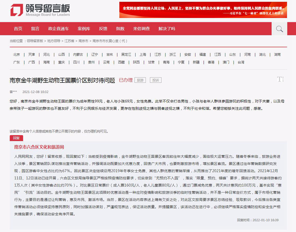 2021年12月8日,網(wǎng)友在人民網(wǎng)“領(lǐng)導(dǎo)留言板”向南京市市長留言稱,南京市金牛湖野生動物王國的票價為成年男性99元,老人與小孩69元,女性免費。此舉不僅打擊男性、小孩與老年人參園游玩的積極性,而且對于夫妻以及母親帶孩子一起游玩的群體也不甚友好,不利于公民娛樂與經(jīng)濟(jì)發(fā)展,另外更存在性別歧視與弱者歧視之嫌,不利于社會和諧。