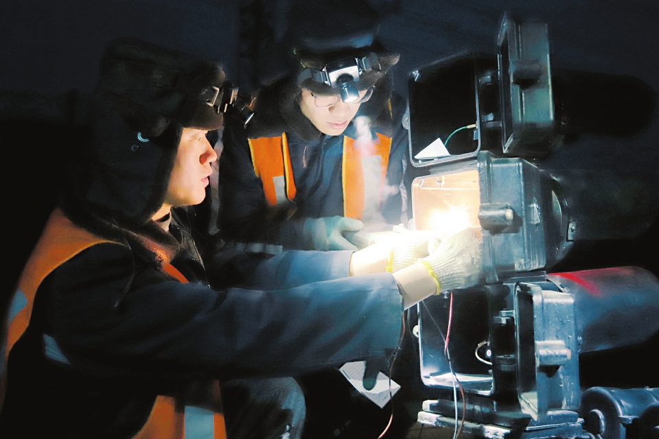 中國鐵路太原局集團(tuán)有限公司侯馬電務(wù)段加大精檢細(xì)修力度,全力消除各種安全隱患,力保春運(yùn)安全暢通。圖為1月17日春運(yùn)首日,該段侯馬車間禮元信號(hào)工區(qū)職工,利用凌晨5時(shí)26分至7時(shí)26分的“天窗時(shí)間”認(rèn)真檢修作業(yè)。(白鵬攝)