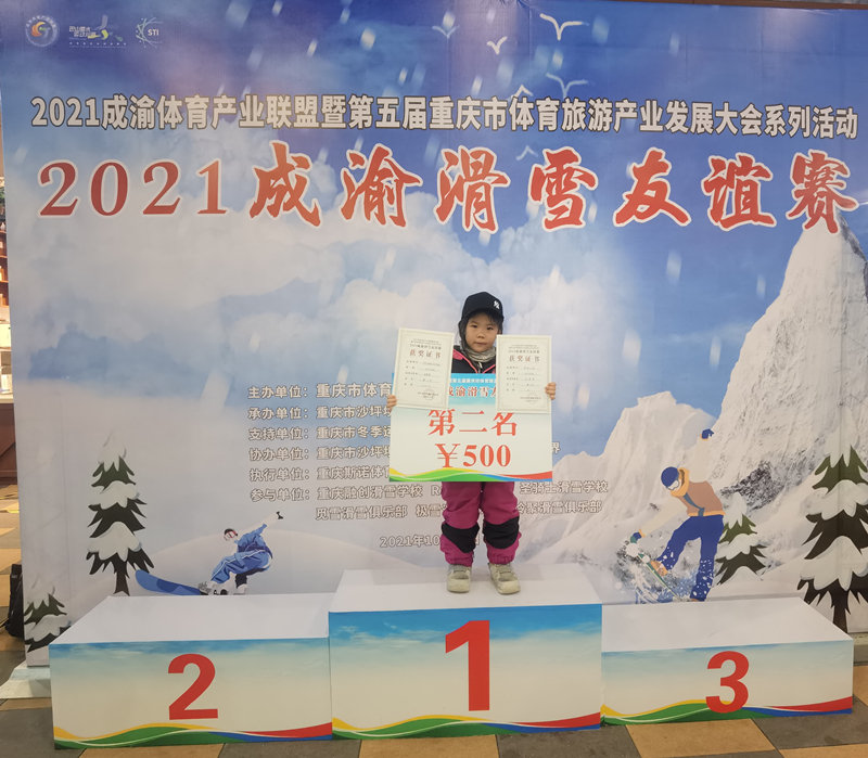 2021年夏天,萱萱迎來了第一場比賽——成渝滑雪友誼賽女子少年(U12)組比賽。當(dāng)時4歲的萱萱是全場最小的參賽者,其他和她同臺角逐的都是8到12歲的小朋友。在平行回轉(zhuǎn)和坡面障礙兩個項目中,萱萱捧回了兩個第二名。