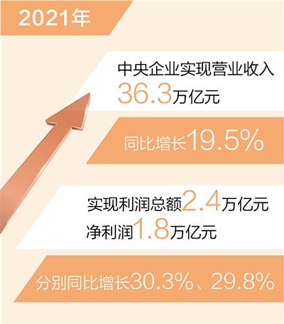 本報北京1月19日電 (記者劉志強)記者從國務(wù)院國資委了解到:去年中央企業(yè)經(jīng)營規(guī)模、經(jīng)濟效益和運行質(zhì)量保持穩(wěn)中向好、快中提質(zhì),為我國經(jīng)濟發(fā)展作出重要貢獻。2021年,中央企業(yè)實現(xiàn)營業(yè)收入36.3萬億元,同比增長19.5%,兩年平均增長8.2%;實現(xiàn)利潤總額2.4萬億元、凈利潤1.8萬億元,分別同比增長30.3%、29.8%,兩年平均增速分別為14.5%、15.3%。營業(yè)收入、利潤總額、凈利潤等主要指標(biāo)均創(chuàng)歷史最好水平。