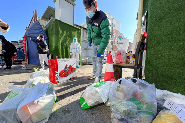 為保障居民買菜用餐等正常生活,院內(nèi)居民可以通過外賣快遞采購物資,也可以通過社區(qū)代為采購。封控區(qū)居民通過快遞外賣的購買物品,會在消殺后,由工作人員送至門口。對不會使用網(wǎng)絡(luò)購物的居民,社區(qū)提供了配餐和送貨上門服務。