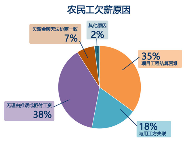 在群眾留言中,農(nóng)民工欠薪的情況大部分為薪資未全額支付,這類(lèi)占留言總數(shù)的約82%;無(wú)勞動(dòng)合同、反復(fù)追討無(wú)果以及拖欠生活費(fèi)的情況也有發(fā)生。項(xiàng)目工程結(jié)算困難、用工方推諉則是導(dǎo)致欠薪的主要原因。