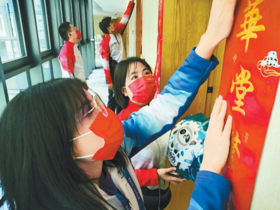 服務保障人員的村內(nèi)生活也趣味十足。下午3點多,一場“守海陀歲·延慶冬奧村新村民共贏未來”主題活動在訪客中心舉行?!拔⑿Φ难?,為大地開花;愛灑向手心,純潔無瑕……”中外志愿者們用12種語言唱起北京冬奧會志愿者之歌《燃燒的雪花》,擊鼓傳花,匿名交換明信片,現(xiàn)場溫馨又熱鬧。而在媒體中心,志愿者寫福字,貼福字,迎接春節(jié)和冬奧的到來。晚上6點多,延慶冬奧村還迎來了“志愿者虎年春節(jié)聯(lián)歡晚會”,志愿者各顯身手帶來彈唱、傳統(tǒng)曲藝、芭蕾舞表演等節(jié)目,以“線上村晚”開啟新的一年。