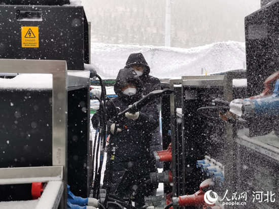 暴雪中,國網(wǎng)冀北電力場館電力保障隊員來到云頂滑雪公園巡視供電設備。 欒志成攝