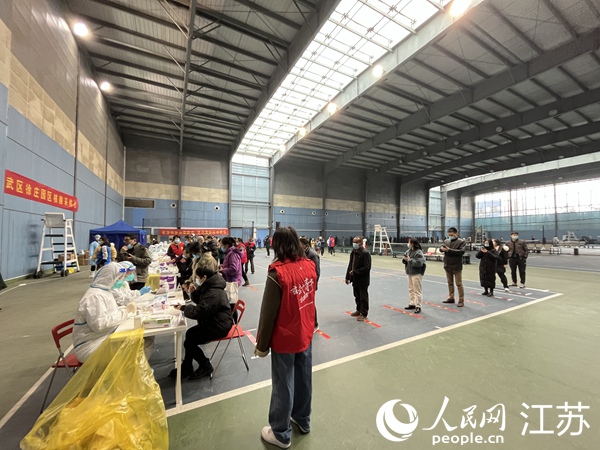 徐莊高新區(qū)體育中心網(wǎng)球館臨時(shí)集中檢測(cè)點(diǎn),志愿者有序引導(dǎo)市民保持一米距離。人民網(wǎng) 李子佩攝