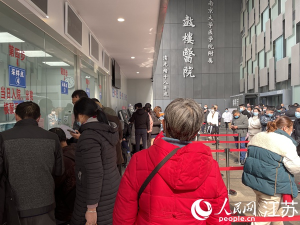 由于檢測(cè)人數(shù)較多,南京鼓樓醫(yī)院的核酸檢測(cè)隊(duì)伍存在一米間距不足的問(wèn)題。人民網(wǎng) 馬曉波攝
