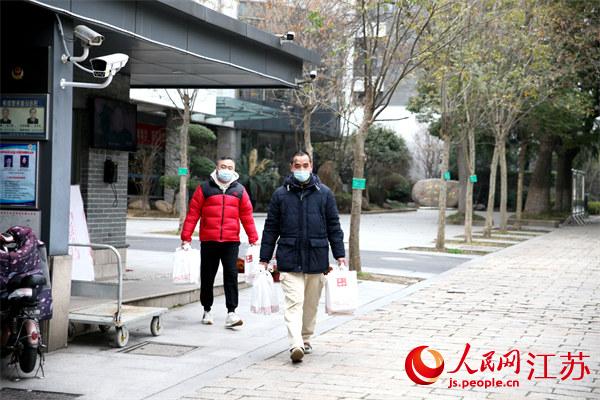 蘇州吳中區(qū)木瀆鎮(zhèn)愛心人士嚴(yán)麗萍(右一)等為管控區(qū)送上愛心蔬菜。木瀆鎮(zhèn)供圖