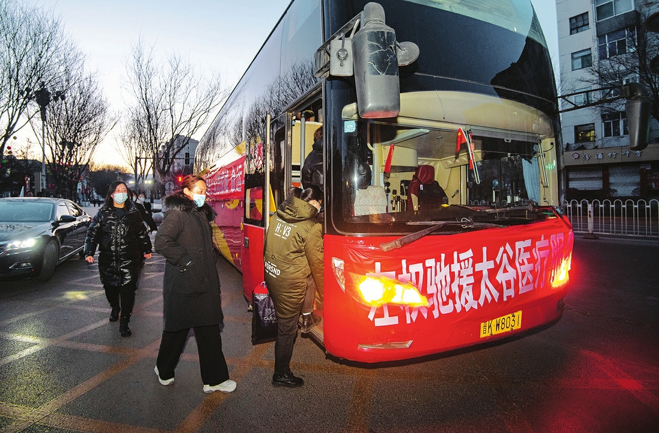 2月22日,左權(quán)縣馳援太谷區(qū)核酸采樣服務(wù)隊醫(yī)護人員乘專車赴太谷開展核酸檢測采樣工作。這是繼2月20日,該縣派出的第三批援谷醫(yī)護人員。(張文軍攝)