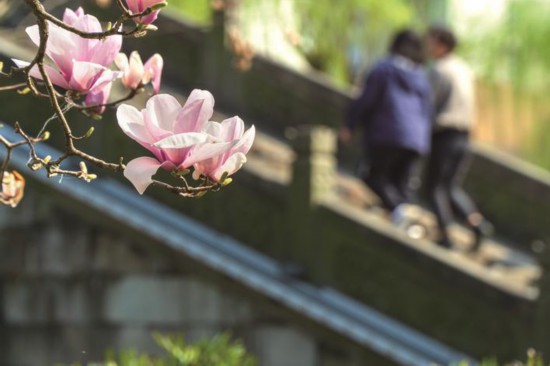 3月13日下午,嘉興海寧市區(qū)市河中心的“口袋公園”小蕩公園春色撩人,粉色的玉蘭花、白色的櫻花點(diǎn)綴其中,吸引市民前來(lái)打卡。(石月平)