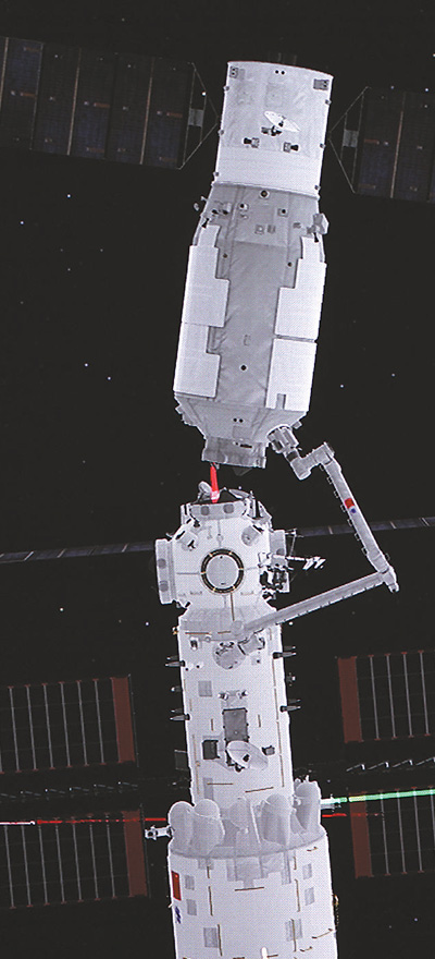 在北京航天飛行控制中心拍攝的空間站機械臂轉位貨運飛船試驗畫面,天舟二號貨運飛船在機械臂拖動下,以核心艙節(jié)點艙球心為圓心進行平面轉位。