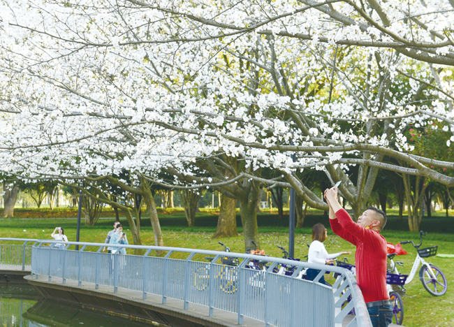 3月17日下午,在浙江義烏植物園,數(shù)百株櫻花在綠水環(huán)抱間悄然綻放。微風拂來,雪球般的櫻花輕輕搖曳枝頭,美不勝收。不少市民和游客前來賞花、拍照,享受春日美景。(錢旭升)