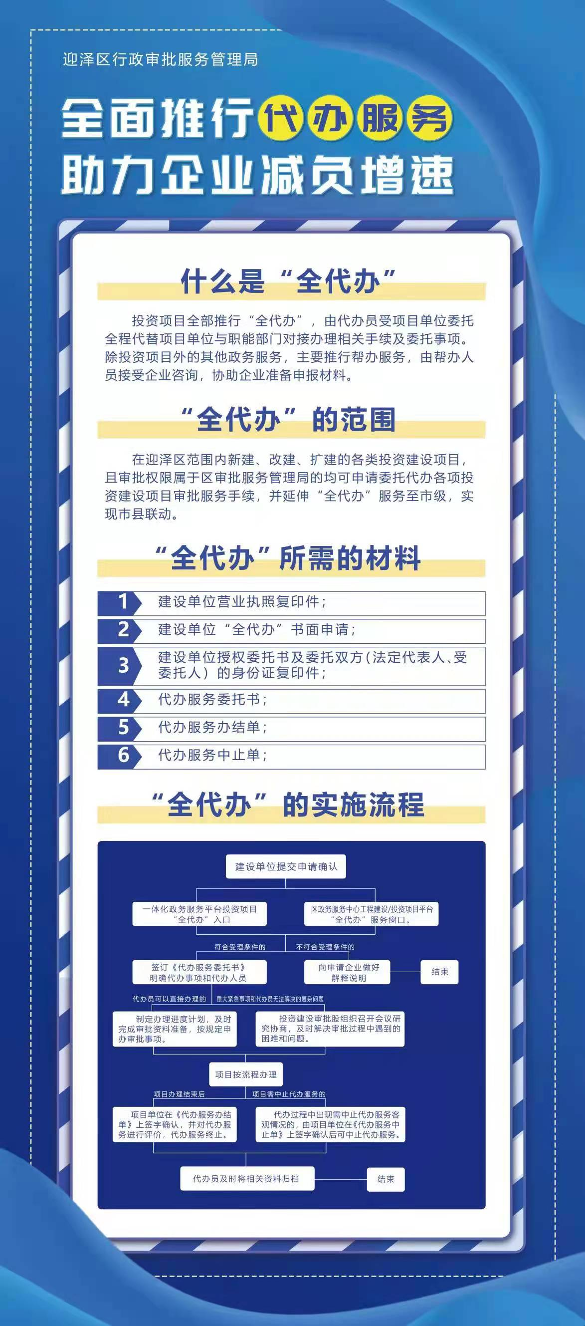 據(jù)介紹,針對項(xiàng)目審批手續(xù)多、時(shí)限長等問題,太原市迎澤區(qū)行政審批局梳理堵點(diǎn)痛點(diǎn),實(shí)施流程再造,開展了投資項(xiàng)目建設(shè)“全代辦”服務(wù),按照“合法高效、自愿委托、無償服務(wù)、全程跟蹤、協(xié)同聯(lián)動(dòng)”的原則,為企業(yè)提供委托項(xiàng)目一部門辦、一窗入件、一人代跑、一律免費(fèi)的“全代辦”服務(wù)。