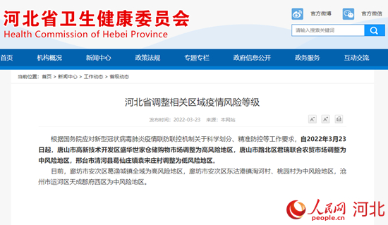 人民網石家莊3月23日電 據(jù)河北省衛(wèi)健委發(fā)布的最新消息,根據(jù)國務院應對新型冠狀病毒肺炎疫情聯(lián)防聯(lián)控機制關于科學劃分、精準防控等工作要求,自2022年3月23日起,唐山市高新技術開發(fā)區(qū)盛華世家倉儲購物市場調整為高風險地區(qū),唐山市路北區(qū)君瑞聯(lián)合農貿市場調整為中風險地區(qū),邢臺市清河縣葛仙莊鎮(zhèn)袁宋莊村調整為低風險地區(qū)。