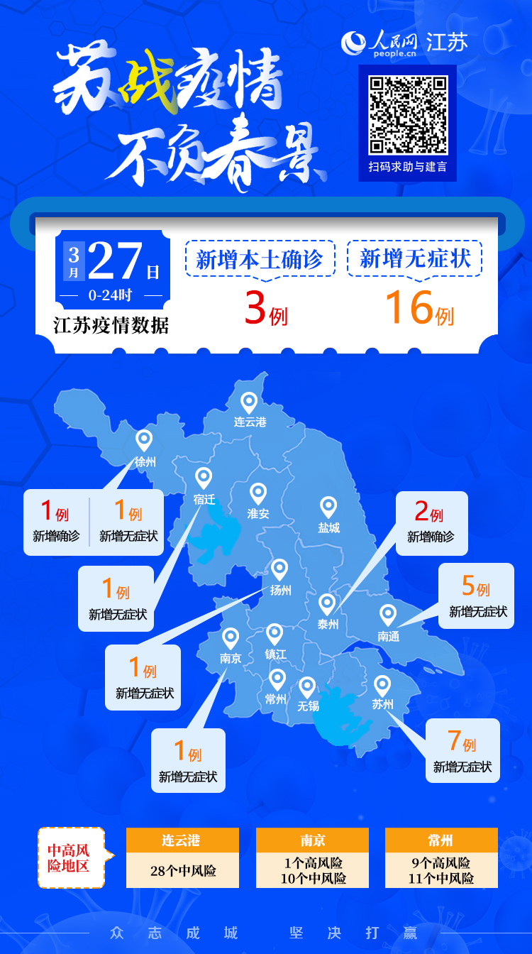 人民網(wǎng)南京3月28日電 據(jù)江蘇省衛(wèi)健委通報(bào),3月27日0-24時(shí),江蘇新增本土確診病例3例(徐州市1例,泰州市2例,均在定點(diǎn)醫(yī)院隔離治療),新增本土無(wú)癥狀感染者16例(南京市1例,徐州市1例,蘇州市7例,南通市5例,揚(yáng)州市1例,宿遷市1例,均在定點(diǎn)醫(yī)院接受隔離醫(yī)學(xué)觀察)。新增出院病例8例(本土5例,境外輸入3例),解除隔離醫(yī)學(xué)觀察的無(wú)癥狀感染者28例(本土24例,境外輸入4例)。