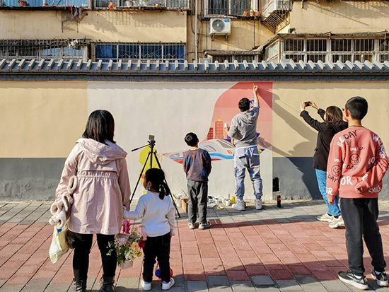 四歲的熱心市民“可樂”看著正在進(jìn)行墻體繪畫的工作人員贊嘆道,“可樂”的媽媽在旁邊開心地笑著。