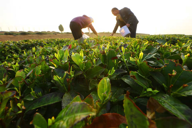 茶農迎著晨曦采茶(資料圖)。 漢宏文攝