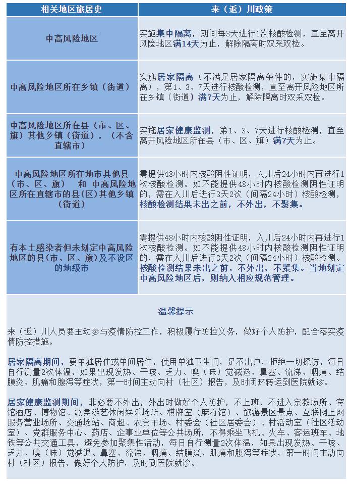 2、對有上海旅居史,于3月29日零時及以后的來(返)川人員實(shí)施居家隔離(不滿足居家隔離條件的,實(shí)施集中隔離),第1、3、7天進(jìn)行咽拭子核酸檢測,直至離開上海滿7天為止,解除隔離時雙采雙檢。其中,來自上海中高風(fēng)險(xiǎn)地區(qū)的按已有規(guī)定實(shí)施14天集中隔離措施不變。