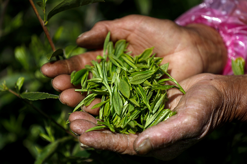 在安徽省霍山縣諸佛庵鎮(zhèn)的百畝茶園內(nèi),茶農(nóng)們乘著晴好天氣,采摘今年的黃芽新茶。雷威攝