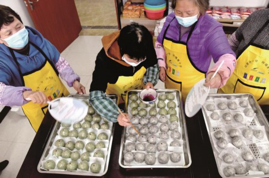 4月1日,嘉興市秀洲區(qū)新塍鎮(zhèn)虹橋社區(qū)請來轄區(qū)的幾位巧手奶奶一起做青團,送到志愿者手中,讓他們在“抗疫”一線也能吃上熱乎乎的時令美食。(馮玉坤)