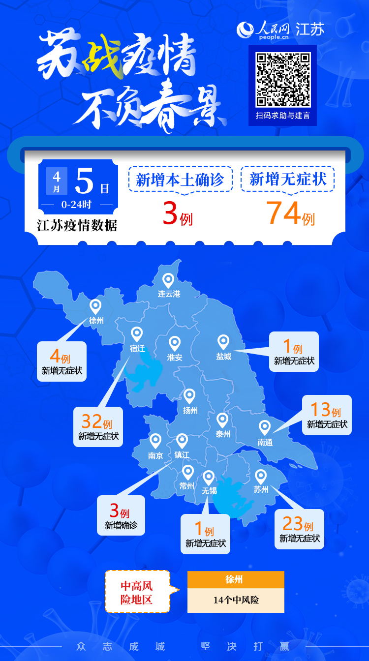 4月5日江蘇新增本土確診病例3例 本土無癥狀感染者74例