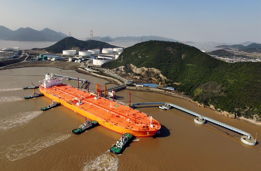 30萬噸巨型油輪靠泊岙山石油轉(zhuǎn)運(yùn)基地。中國(guó)(浙江)自由貿(mào)易試驗(yàn)區(qū)舟山管理委員會(huì)供圖