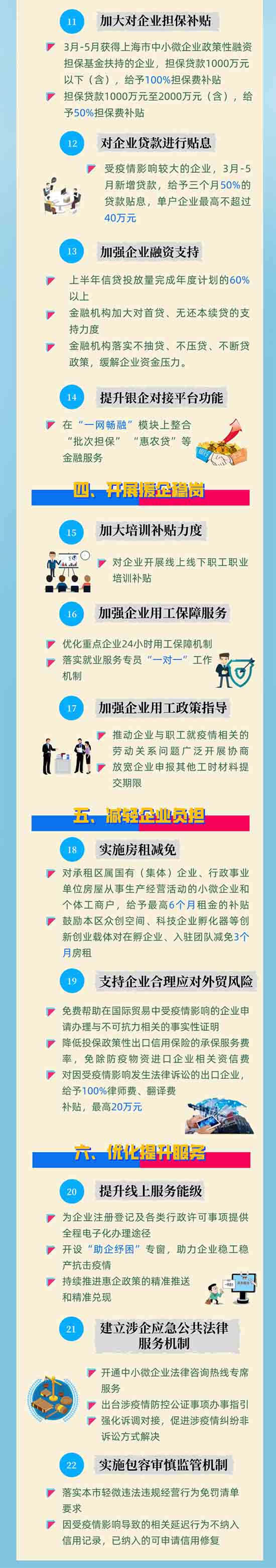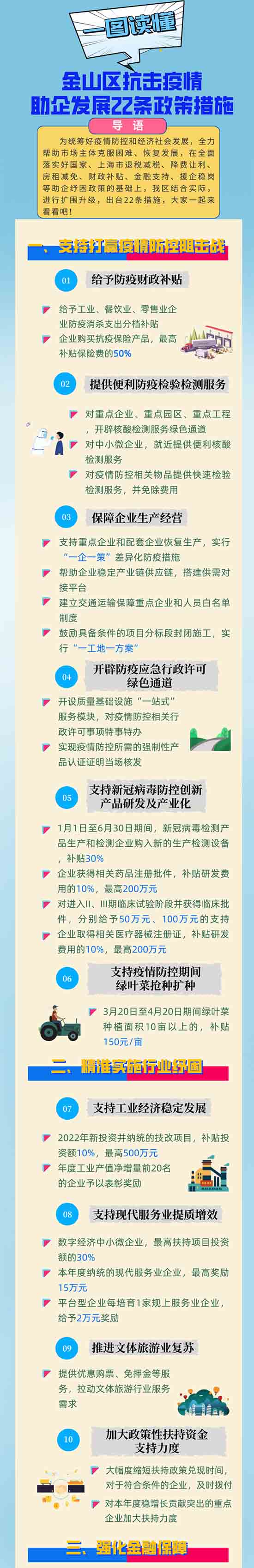 據(jù)悉,為統(tǒng)籌好疫情防控和經(jīng)濟社會發(fā)展,全力幫助市場主體克服困難、恢復(fù)發(fā)展,在全面落實好國家、上海市退稅減稅、降費讓利、房租減免、財政補貼、金融支持、援企穩(wěn)崗等助企紓困政策的基礎(chǔ)上,結(jié)合金山實際,進行擴圍升級,制訂《金山區(qū)抗擊疫情助企發(fā)展22條政策措施》?!?2條”既聚焦企業(yè)當(dāng)前面臨的“難點”“痛點”“堵點”,又考慮到疫情后企業(yè)加快發(fā)展的各項訴求,共計包括六大方面內(nèi)容,即支持打贏疫情防控阻擊戰(zhàn)、精準(zhǔn)實施行業(yè)紓困、強化金融保障、開展援企穩(wěn)崗、減輕企業(yè)負擔(dān)及優(yōu)化提升服務(wù),用實實在在的舉措,精準(zhǔn)幫助市場主體紓困解難,穩(wěn)定經(jīng)濟增長。