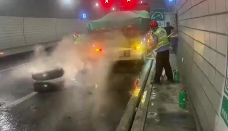 22點(diǎn)3分,巡查員通過(guò)對(duì)向隧道的汽通門(mén)第一時(shí)間進(jìn)入現(xiàn)場(chǎng),施救人員從同向到達(dá)現(xiàn)場(chǎng),一次“雙向奔赴”的救火就此展開(kāi)。一名巡查員與施救人員緊密配合,拿出水槍?zhuān)瑢?duì)著起火點(diǎn)進(jìn)行滅火。不出2分鐘,起火點(diǎn)的明火被熄滅,但是溫度還是很高,需要不斷澆水才能阻止輪胎復(fù)燃。另一名巡查員則將司機(jī)帶離到安全地帶,隨后又將車(chē)道上的雜物清理至緊急停車(chē)帶,以便解除卡口后為后續(xù)車(chē)輛提供一個(gè)安全的行車(chē)環(huán)境。22點(diǎn)23分,車(chē)道恢復(fù)暢通。
