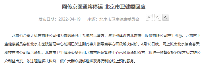 4月18日晚,網(wǎng)上流出北京怡合春天科技有限公司停運(yùn)通知。北京市衛(wèi)生健康委員會和北京市醫(yī)院管理中心已緊急通知雙方,將進(jìn)一步督促指導(dǎo)雙方從維護(hù)公眾利益出發(fā),依法理性解決糾紛,使廣大群眾能夠繼續(xù)獲得便利的線上預(yù)約服務(wù)。