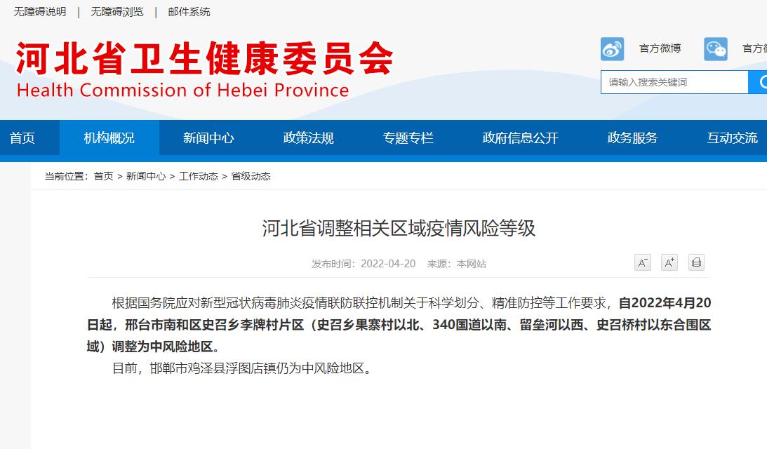 河北省調(diào)整相關(guān)區(qū)域疫情風(fēng)險(xiǎn)等級(jí) 邢臺(tái)市南和區(qū)史召鄉(xiāng)李牌村片區(qū)調(diào)整為中風(fēng)險(xiǎn)地區(qū)